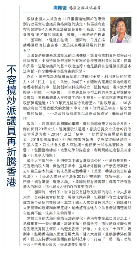 根據全國人大常委會11日審議通過關於香港特別行政區立法會議員資格問題的決定,特區政府宣布郭榮鏗等4人喪失立法會議員資格。為此,立法會裏有15名攬炒派議員「鬧辭」,他們是在捍衛「一國兩制」,還是在破壞「一國兩制」?是在推動香港經濟社會進步,還是成為香港發展的絆腳石?
