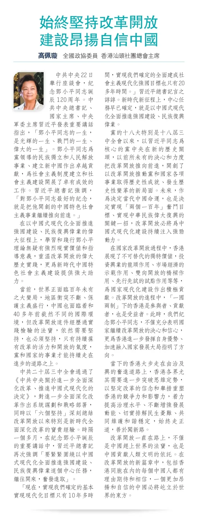 在國家改革開放過程中,香港展現了不可替代的獨特價值,投資興業的龍頭作用、市場經濟的示範作用、雙向開放的橋樑作用、先行先試的試點作用等等,為國家現代化建設作出積極貢獻。改革開放的進程中,「一國兩制」下的香港是參與者、貢獻者,也是受益者。此時,我們紀念鄧小平同志,不僅充分展現國家繼續改革開放的決心與信心,更為香港進一步發揮自身優勢、加速融入國家發展大局指明了方向。