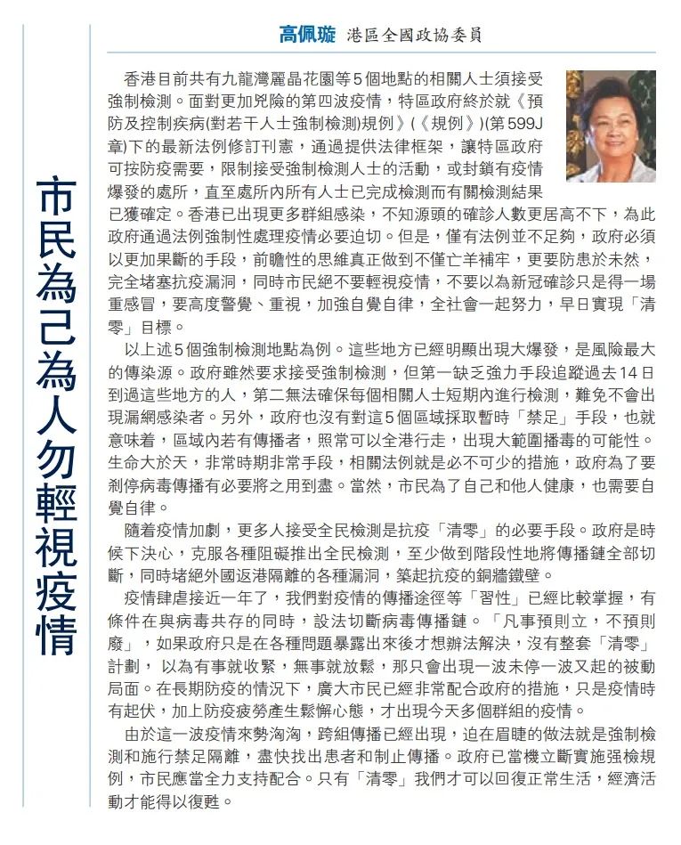 香港目前共有九龍灣麗晶花園等5個地點的相關人士須接受強制檢測。面對更加兇險的第四波疫情,特區政府終於就《預防及控制疾病(對若干人士強制檢測)規例》(《規例》)(第599J章)下的最新法例修訂刊憲,通過提供法律框架,讓特區政府可按防疫需要,限制接受強制檢測人士的活動,或封鎖有疫情爆發的處所,直至處所內所有人士已完成檢測而有關檢測結果已獲確定。香港已出現更多群組感染,不知源頭的確診人數更居高不下,為此政府通過法例強制性處理疫情必要迫切。但是,僅有法例並不足夠,政府必須以更加果斷的手段,前瞻性的思維真正做到不僅亡羊補牢,更要防患於未然,完全堵塞抗疫漏洞,同時市民絕不要輕視疫情,不要以為新冠確診只是得一場重感冒,要高度警覺、重視,加強自覺自律,全社會一起努力,早日實現「清零」目標。