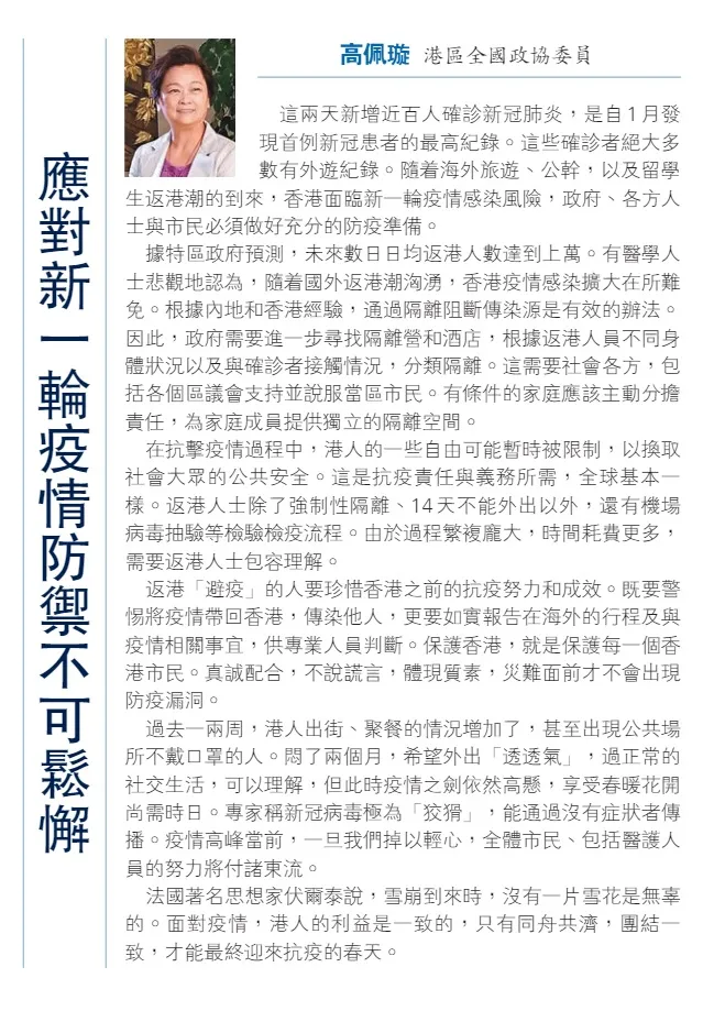 法國著名思想家伏爾泰說,雪崩到來時,沒有一片雪花是無辜的。面對疫情,港人的利益是一致的,只有同舟共濟,團結一致,才能最終迎來抗疫的春天。