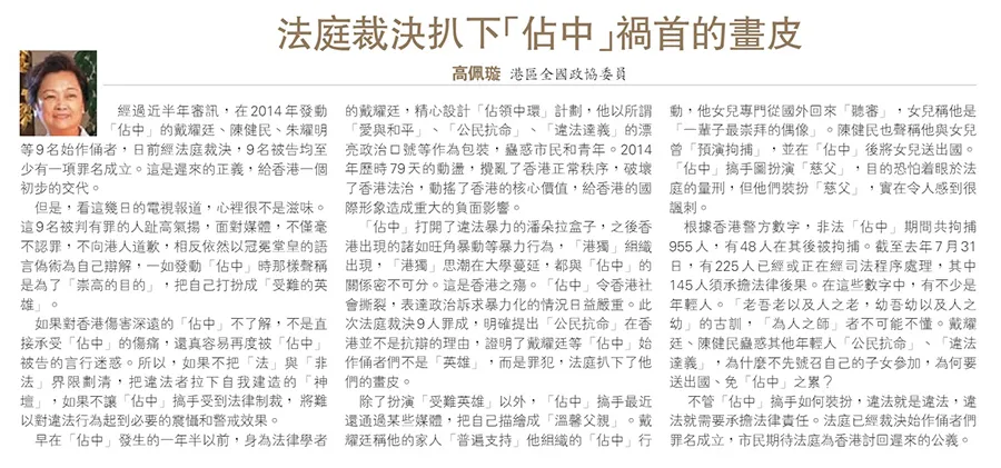 經過近半年審訊,在2014年發動「佔中」的戴耀廷、陳健民、朱耀明等9名始作俑者,日前經法庭裁決,9名被告均至少有一項罪名成立。這是遲來的正義,給香港一個初步的交代。