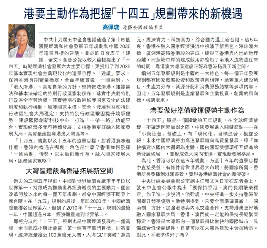 中共十九屆五中全會審議通過了第十四個國民經濟和社會發展五年規劃和中國2035年遠景目標的建議,並於昨日發表了「建議」全文。全會公報以較大篇幅提出了「十四五」時期經濟社會發展六大主要目標,更提出了到2035年基本實現社會主義現代化的遠景目標。「建議」要求,保持香港長期繁榮穩定,全面準確貫徹「一國兩制」、「港人治港」、高度自治的方針,堅持依法治港,維護憲法和基本法確定的特別行政區憲制秩序,落實中央對特別行政區全面管治權,落實特別行政區維護國家安全的法律制度和執行機制,維護國家主權、安全、發展利益和特別行政區社會大局穩定;支持特別行政區鞏固提升競爭優勢,建設國際創新科技中心,打造「一帶一路」功能平台,實現經濟多元可持續發展;支持香港更好融入國家發展大局,高質量建設粵港澳大灣區等。
