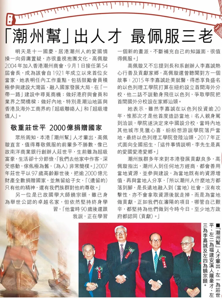 明天是十一國慶,居港潮州人的愛國情操一向毋庸置疑,亦很重視抱團文化,高佩璇2004年加入香港潮州商會,9月1日接任第54屆會長,成為該會自1921年成立以來首位女當家,她表明任內工作重點,包括鼓勵會員積極參與建設大灣區、融入國家發展大局,在「一帶一路」建設中尋覓商機;做好港府與會員和業界之間橋樑;做好內地,特別是潮汕地區與香港及海外工商界的「超級聯絡人」和「超級增值人」。