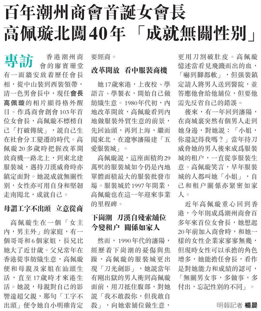 《明報》專訪:百年潮州商會首誕女會長 高佩璇北闖40年 「成就無關性別」