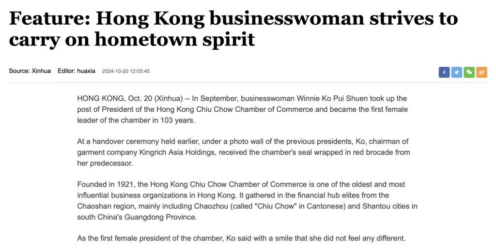 HONG KONG, Oct. 20 (Xinhua) -- In September, businesswoman Winnie Ko Pui Shuen took up the post of President of the Hong Kong Chiu Chow Chamber of Commerce and became the first female leader of the chamber in 103 years.