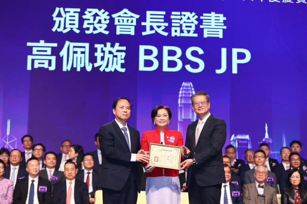 全國政協常委、港澳台僑委員會劉賜貴與香港財政司司長陳茂波為高佩璇頒發證書