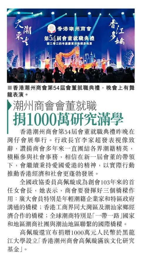 星島日報:潮州商會會董就職 捐款1000萬研究滿族文化