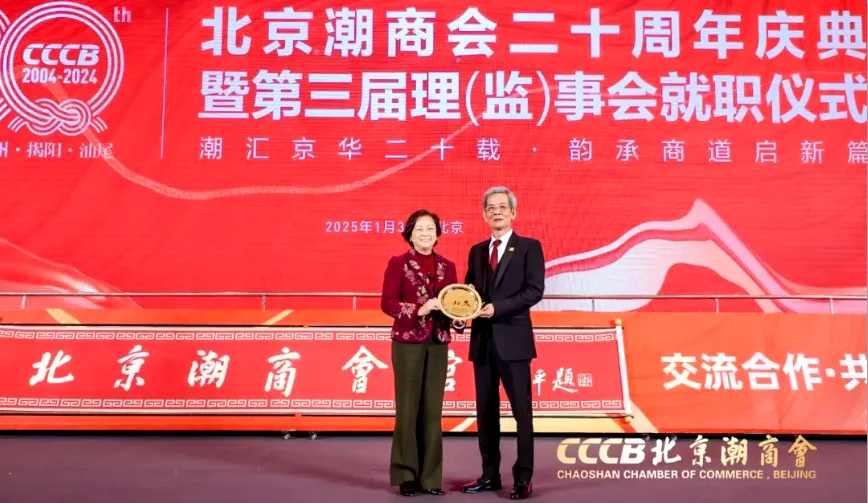 慶典上,集團主席高佩璇博士代表香港潮州商會向北京潮商會贈送紀念禮品。她的出席展現了其在僑界的深厚影響力,以及對全國潮商事業發展的堅定支持,激勵和鼓舞了在場的每一位潮籍鄉親。這一舉動也堅定了京港兩地潮汕商會攜手共進、再創輝煌的信心。