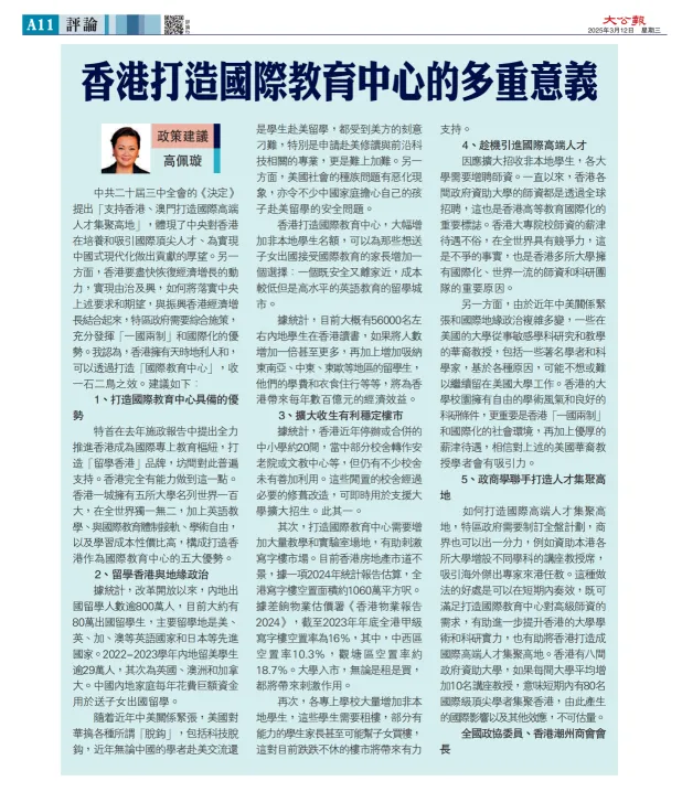 2025年3月12日《大公報》:香港打造國際教育中心的多重意義