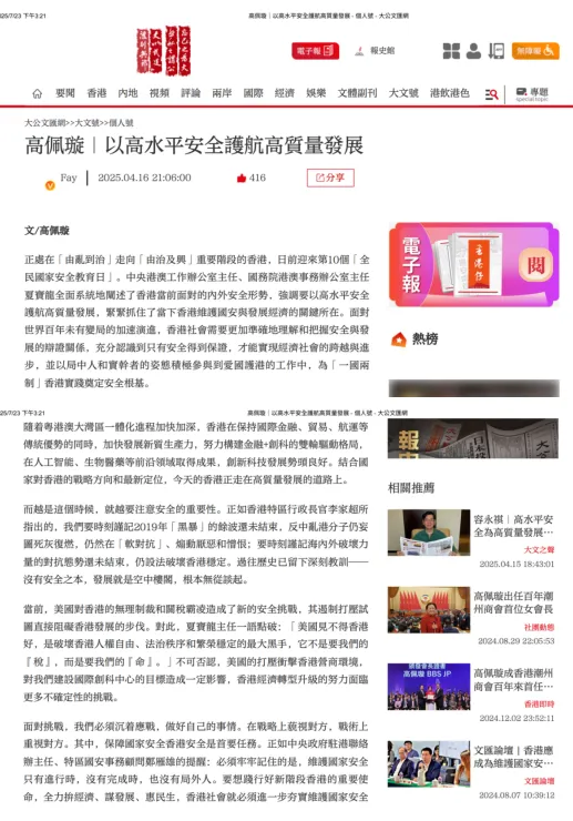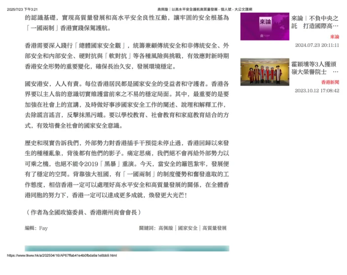 2025年4月16日《大公文匯網》:以高水平安全護航高質量發展