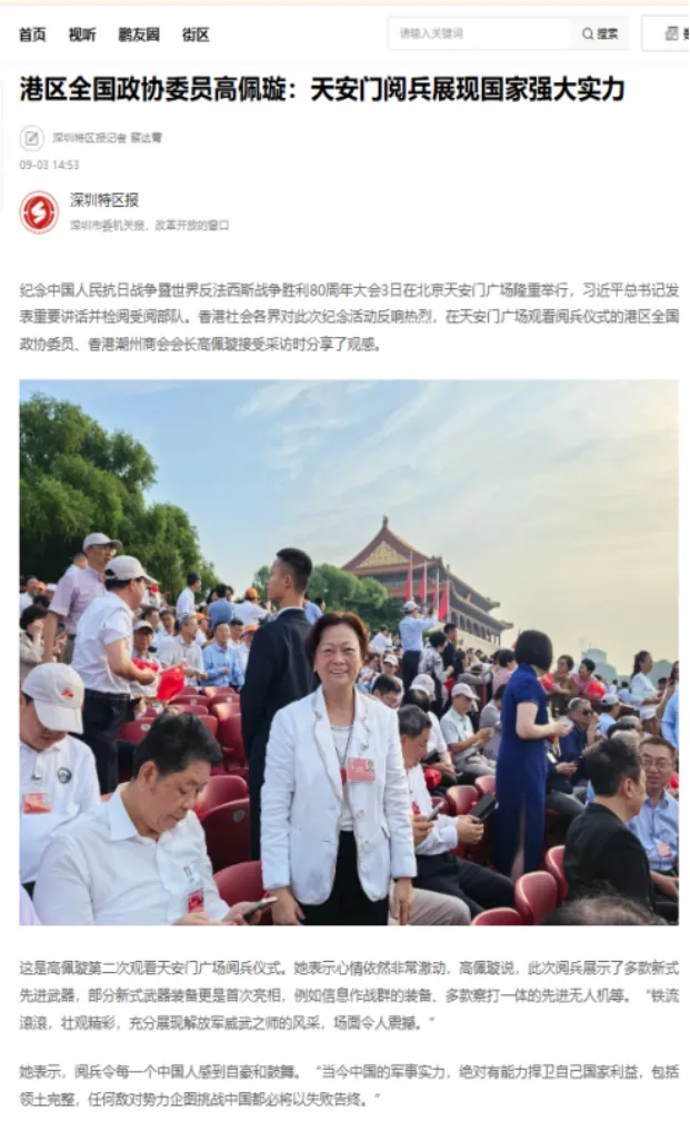 《深圳特區報》——港區全國政協委員高佩璇:天安門閱兵展現國家強大實力
