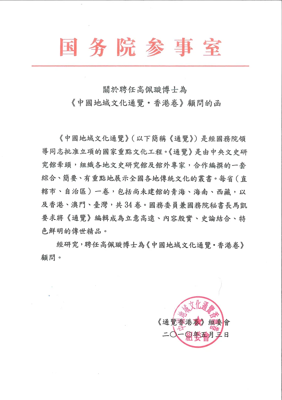 國務院參事室聘任高佩璇博士為中國地域文化通覽香港卷顧問的函